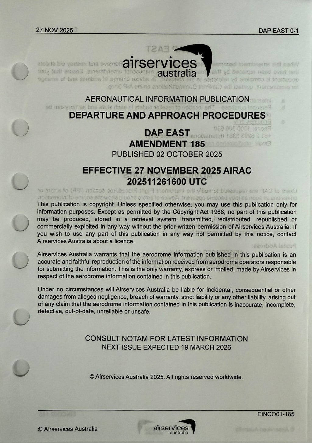 The Departure & Approach Procedures (DAP) are a compilation of instrument procedure charts for Australia, including aerodrome charts and noise abatement procedures where applicable.