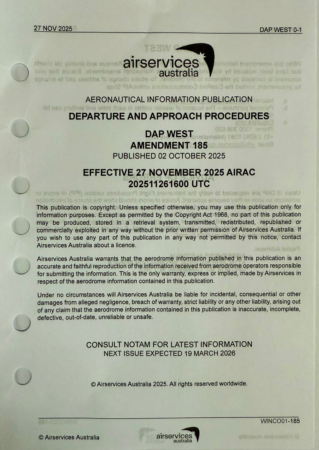 The Departure & Approach Procedures (DAP) are a compilation of instrument procedure charts for Australia, including aerodrome charts and noise abatement procedures where applicable.